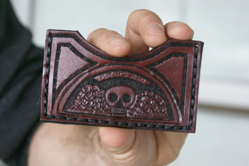 Tara Kloida-White's tooled leather wallets and credit card holders are to die for- actually they are a good reminder that we all will die. These are special gifts for special people. The shop is sevenannine.